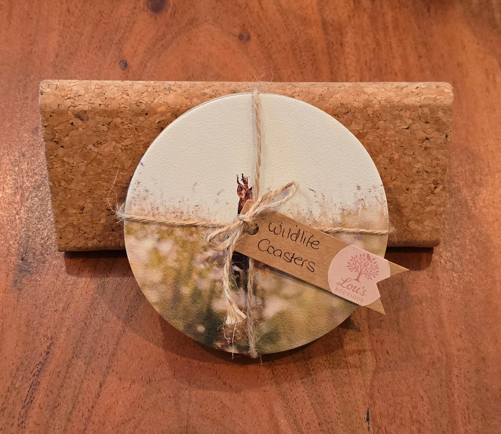 You will get a set of 4 wildlife coasters of British mammals. Hare in Lavender fields, Roe Deer in flower fields, Harvest Mice on thistle and Fox in field.