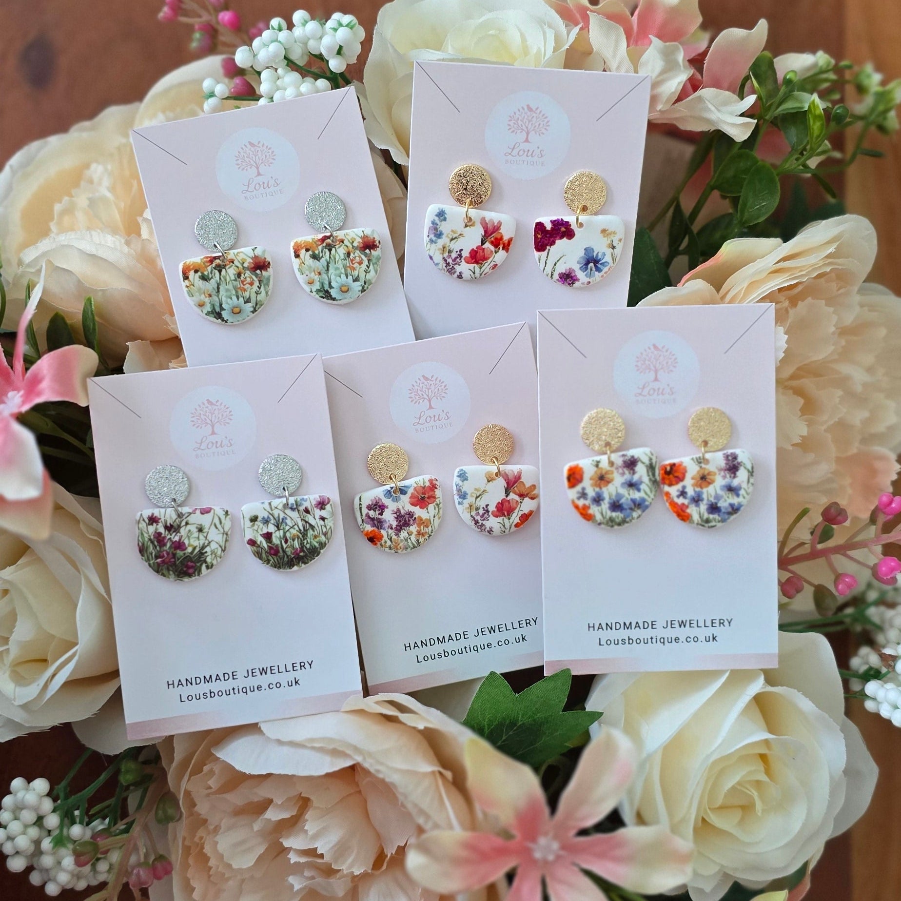 Handmade 14k Gold half moon flower floral gold circle stud earrings |Polymer clay earrings | summer statement earrings | light weight earrings