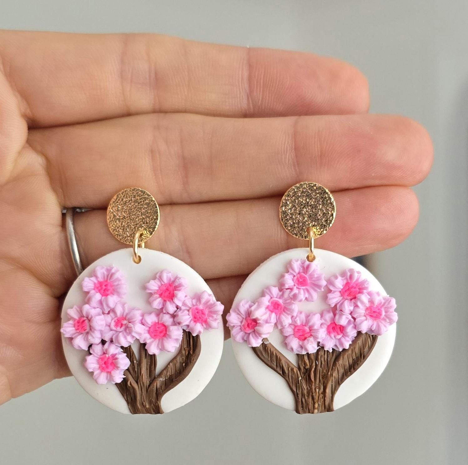 Handmade with love, these unique designed delicate sakura cherry blossom tree polymer clay earrings feature intricate hand crafted trees with cherry blossom leaves leaf, a lot of work has been put into these earrings, making these earrings a wearable piece of art.