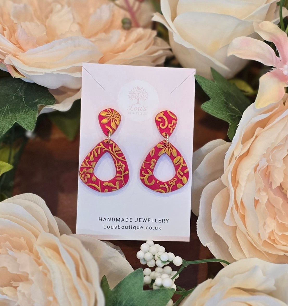Handmade Christmas floral relief dangle stud Earrings, festive season, red, green, black and gold