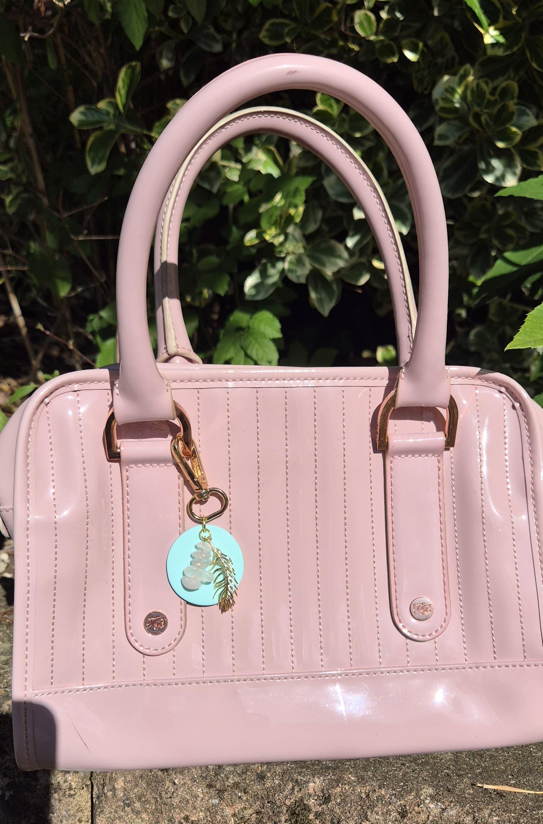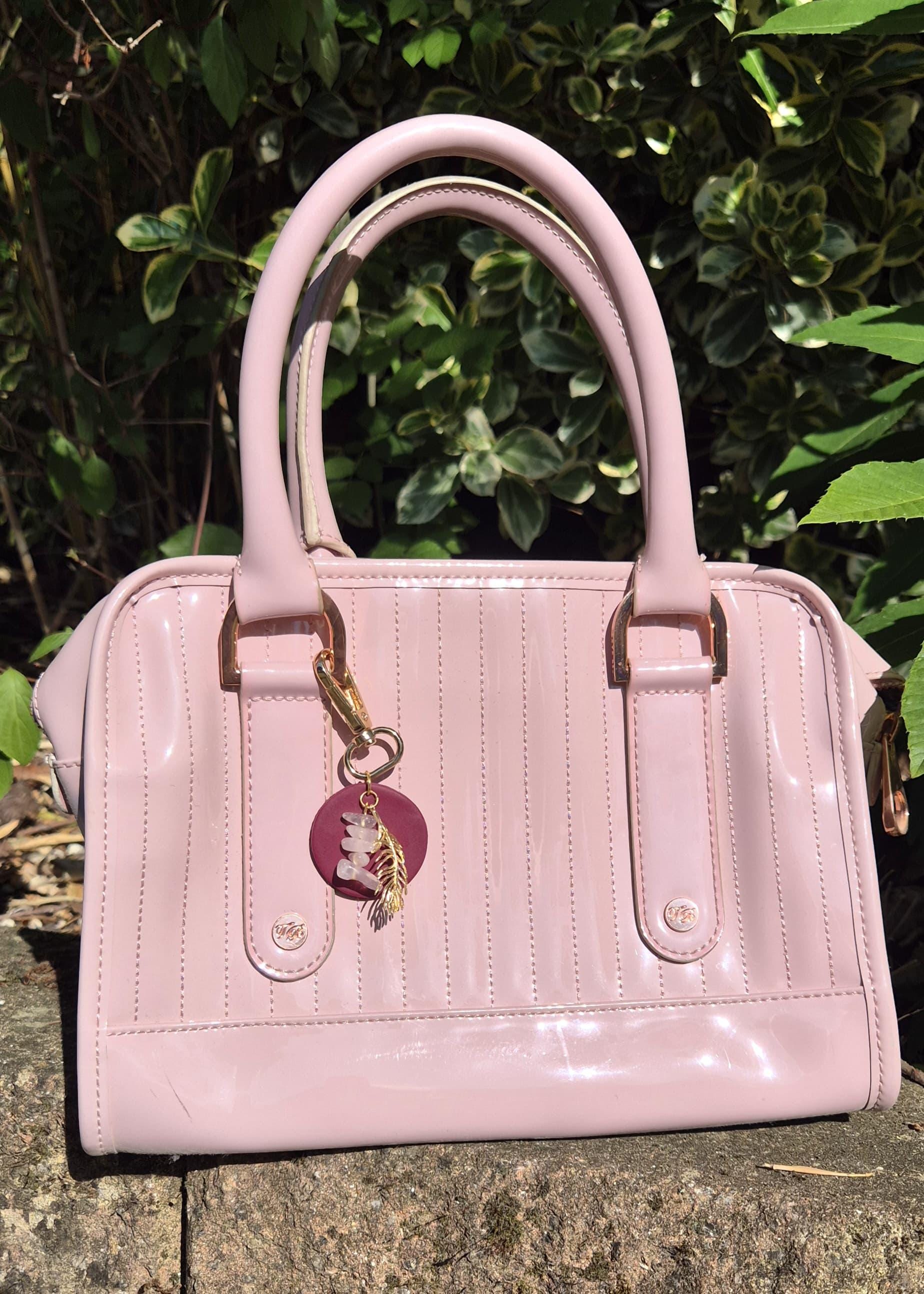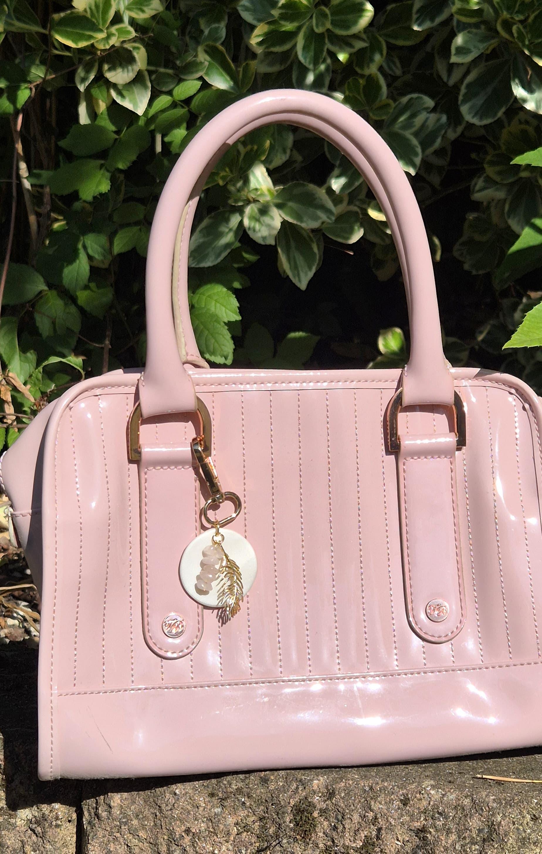 Handmade clay circle rose quartz and 14k gold plated feather bag charm. choose your colour; mint, dusky pink, plum, pearly white.