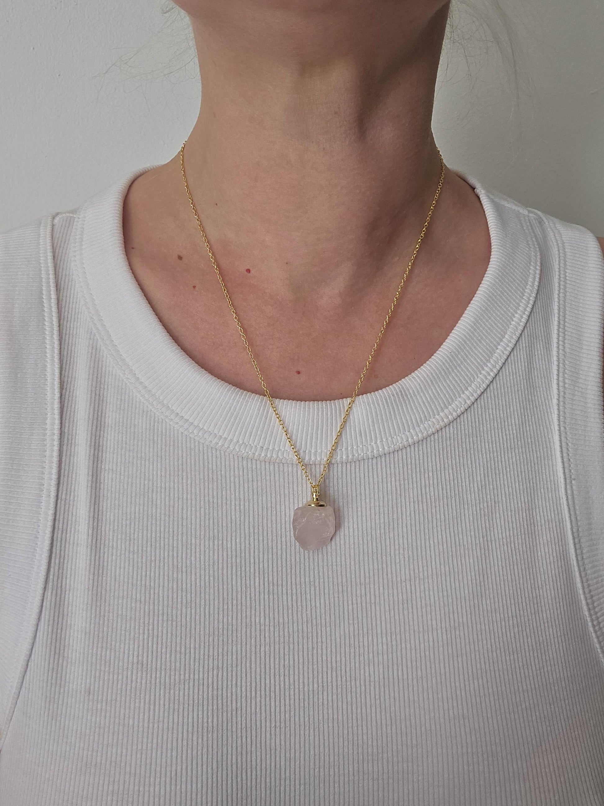 Real genuine rose quartz crystal necklace set in a sterling silver or 14k gold plated necklace and pendant cup.