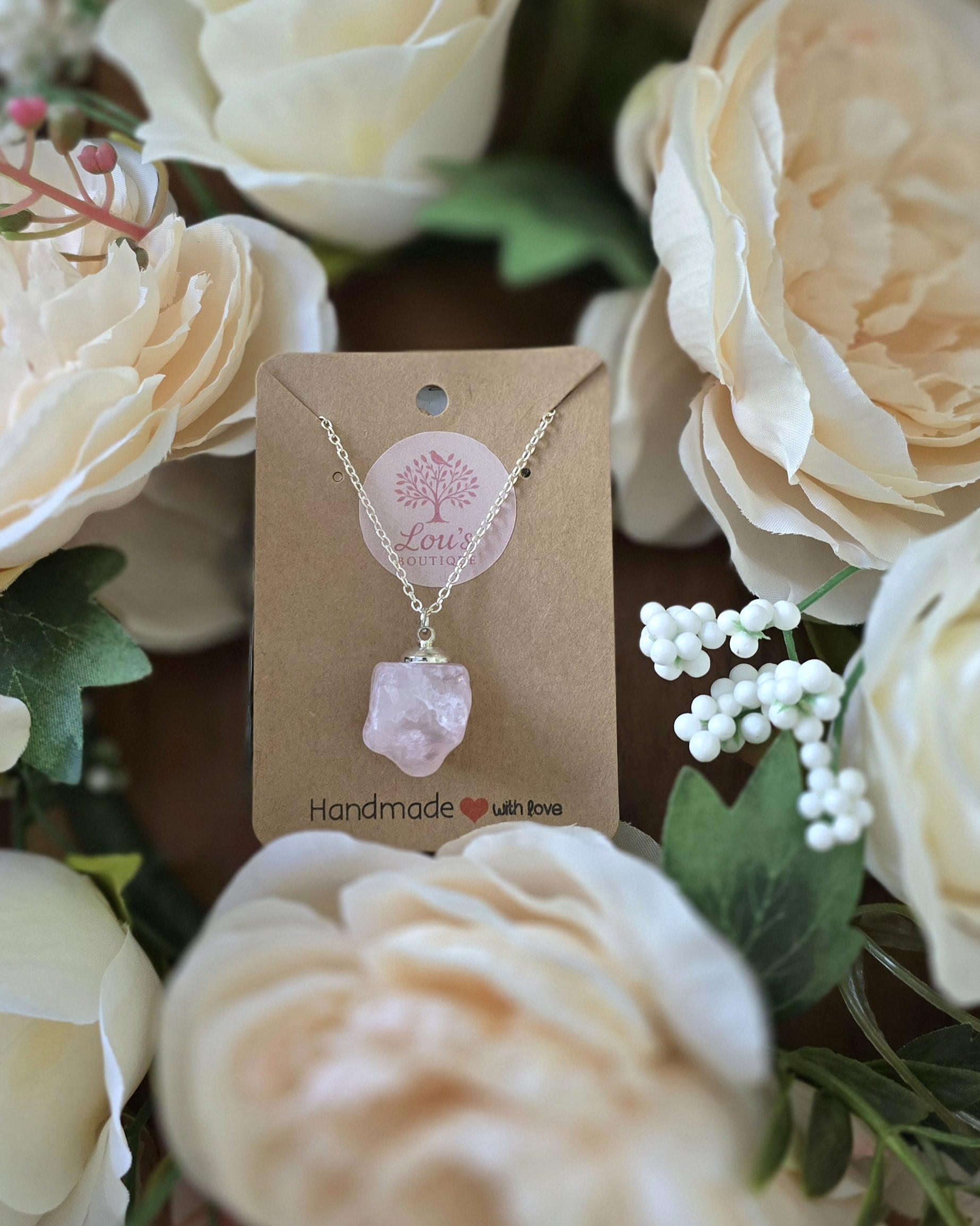 Rose Quartz is a very powerful healing crystal, perfect if you need to increase your self love or have emotional healing. Necklace is 18inches long Rose quartz is connected to the heart chakra and is a stone of unconditional love and peace. It promotes emotional healing, compassion, and the ability to give and receive love. Its gentle pink hue is linked to gentleness, soothing energy, and self-love.